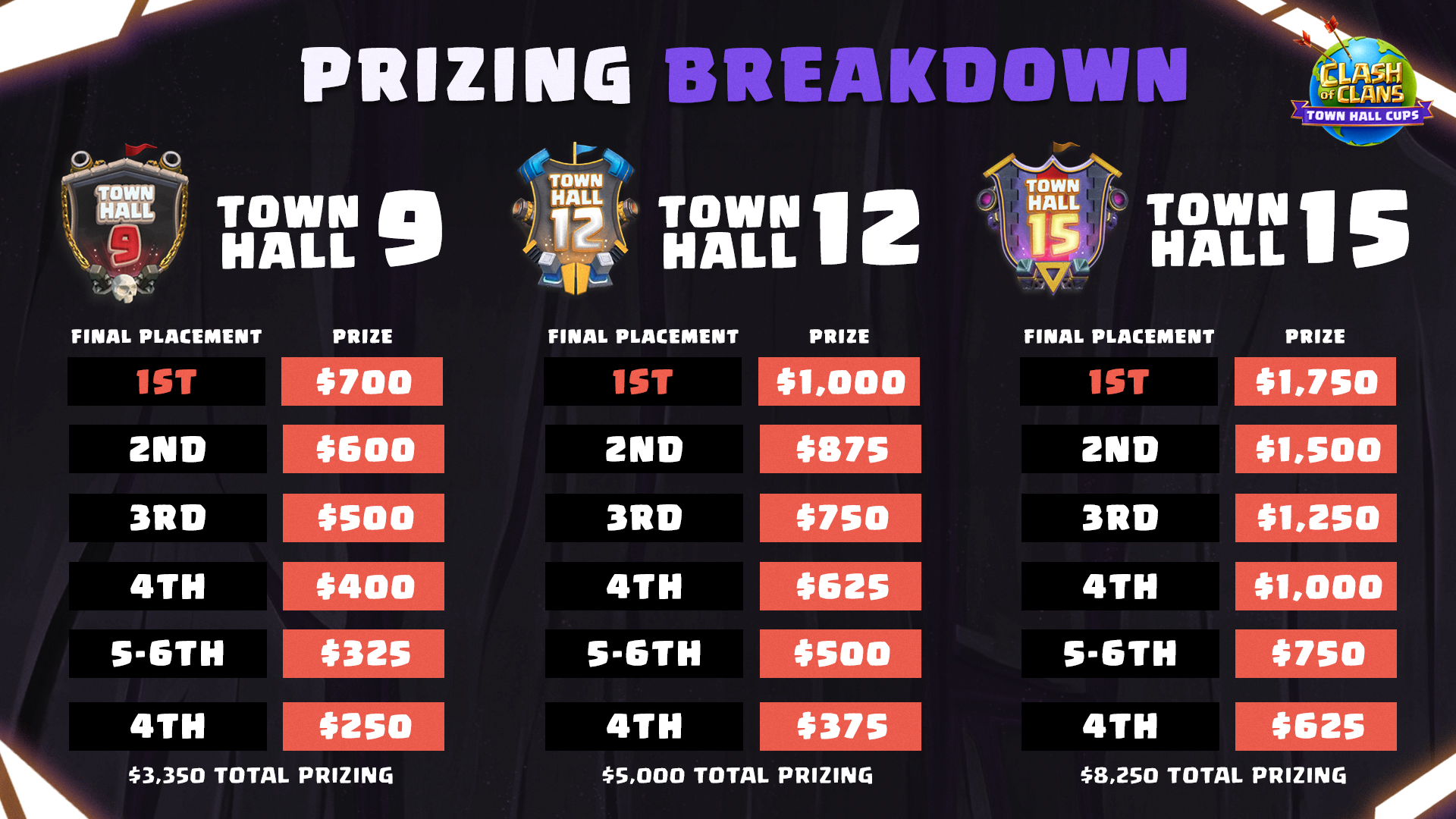 • Town Hall 15 Cup: $8,250 total prize pool per event